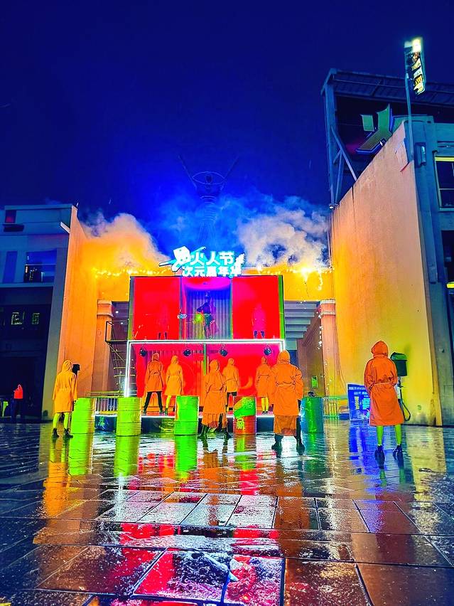 火人节次元嘉年华,雨夜中霓虹绚烂,表演者与装置尽显潮流狂欢氛围。