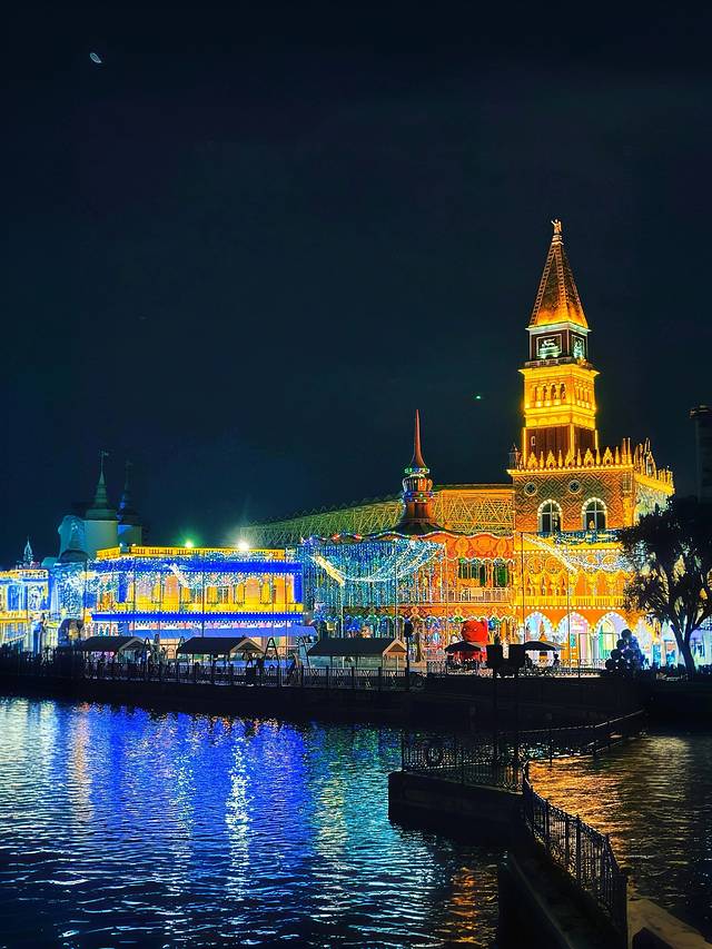 世界之窗夜景,建筑灯火璀璨,倒映在水面上,梦幻如童话世界。