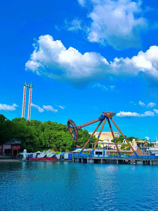 蓝天碧水间,大摆锤与跳楼机矗立,乐园刺激与景致明媚交融。
