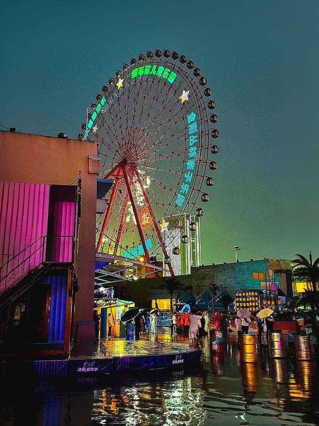 摩天轮灯火绚烂,游人穿梭,雨夜中的乐园浪漫又热闹。