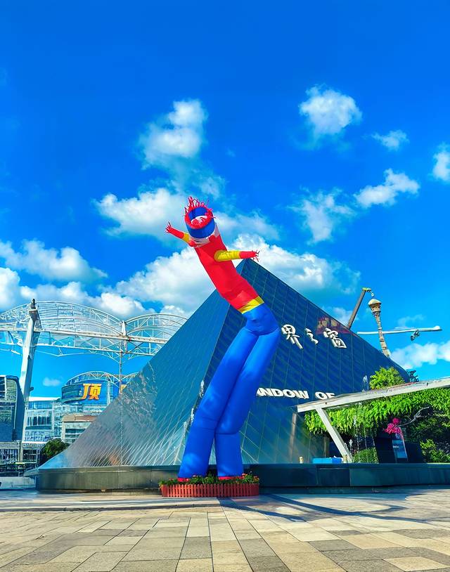 蓝天下玻璃建筑前,彩色充气人偶灵动,尽显乐园活力与夏日明媚。