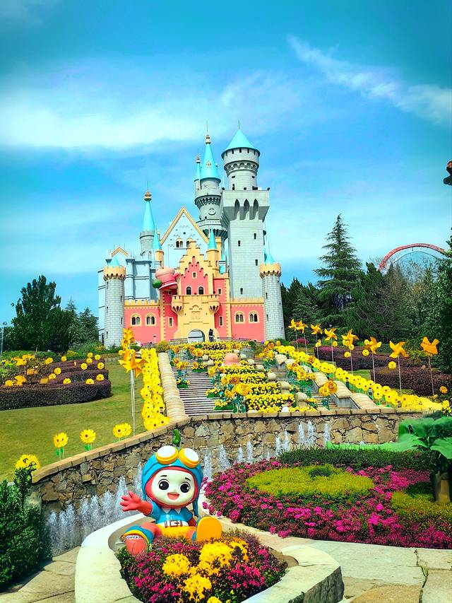 童话城堡前繁花似锦,可爱人偶点缀,满是梦幻童趣与夏日生机。