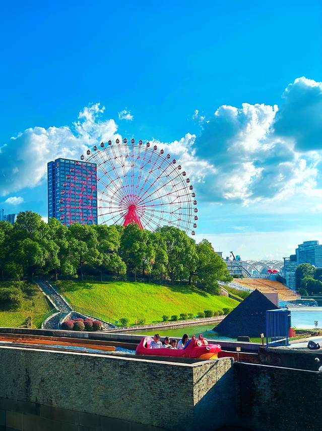 红摩天轮与水上设施相映,蓝天绿树间,满是乐园的活力与浪漫。