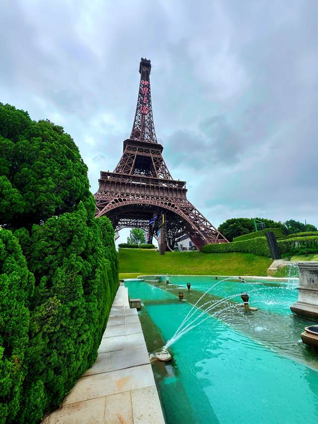 埃菲尔铁塔景观前,喷泉灵动、绿植葱郁,尽展微缩世界的浪漫风情。假装在巴黎