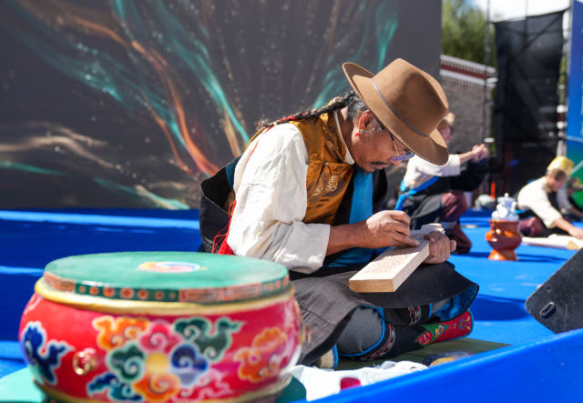 9月12日,在第四届藏香文化旅游节开幕式现场,木雕艺人展示尼木木雕工艺。
