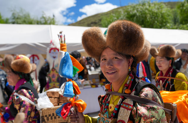 9月12日,人们在第四届藏香文化旅游节开幕式现场展示尼木县特色产品。