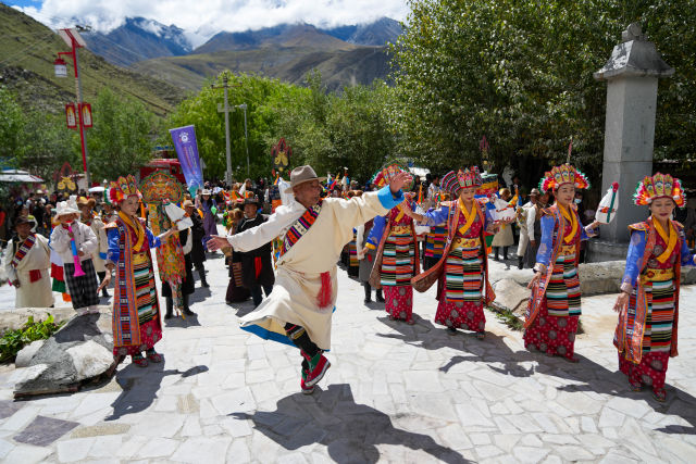 9月12日,在第四届藏香文化旅游节开幕式现场,当地群众身着盛装进行巡游。