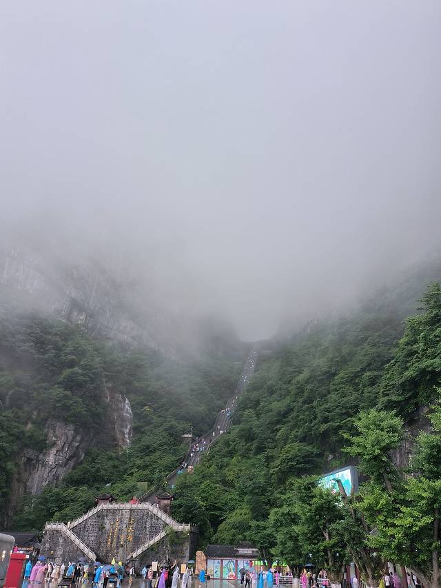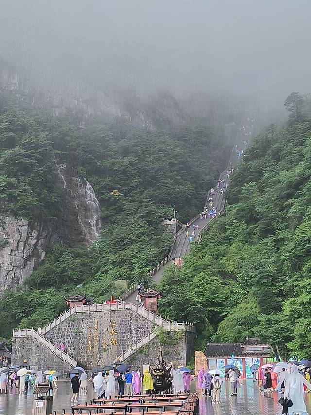 下了索道就开始下雨,雨势还不小,天门洞完全看不见。山上温度比山下低,又下雨,幸亏买了雨衣,还有保暖的作用。
