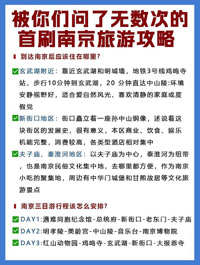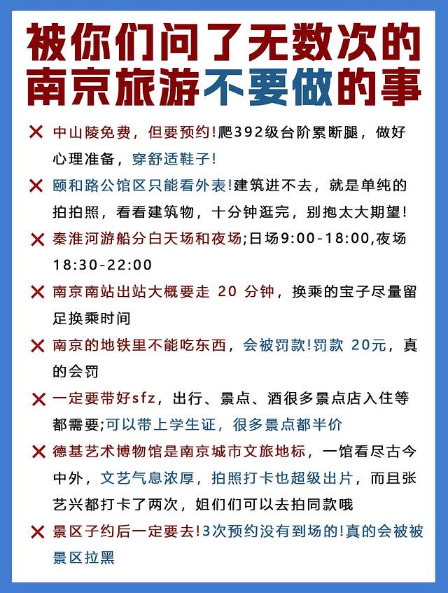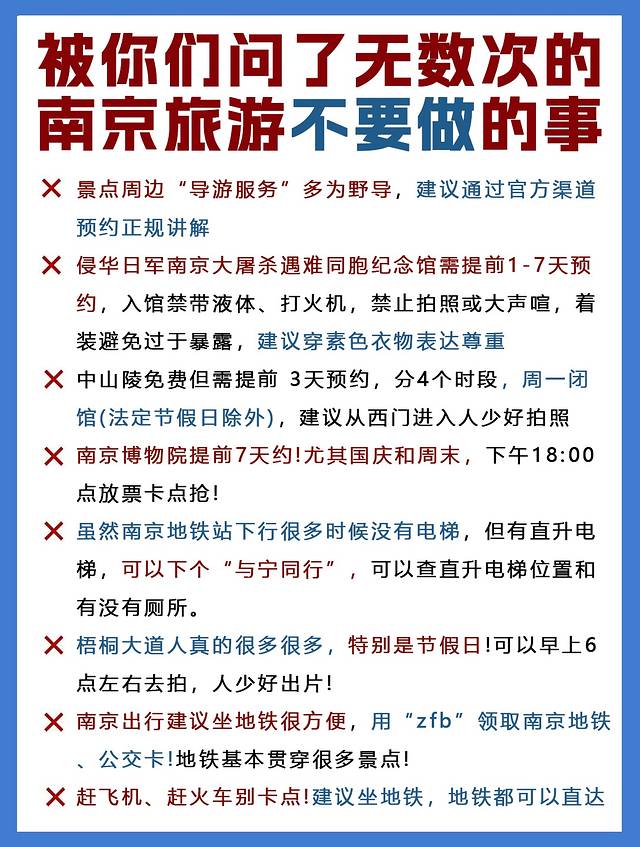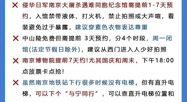 中山陵、夫子庙、南京博物院这些热门打卡点,国庆期间一定提前3天以上预约!想避开人潮,推荐早7点半前出发,尤其是中山陵和博物院,早到不仅能错峰,还能感受清晨金陵的静谧氛围⚠️
