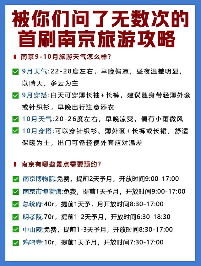 国庆南京早晚微凉,白天秋高气爽,偶有阵雨偷袭,建议随身备上薄风衣、防滑舒适的鞋子,便携雨具也别忘了揣包里~