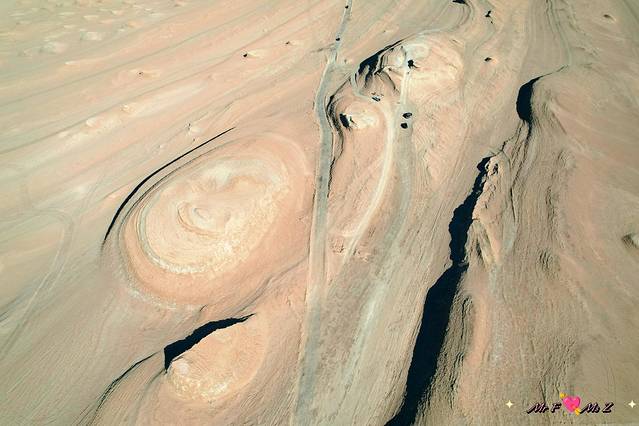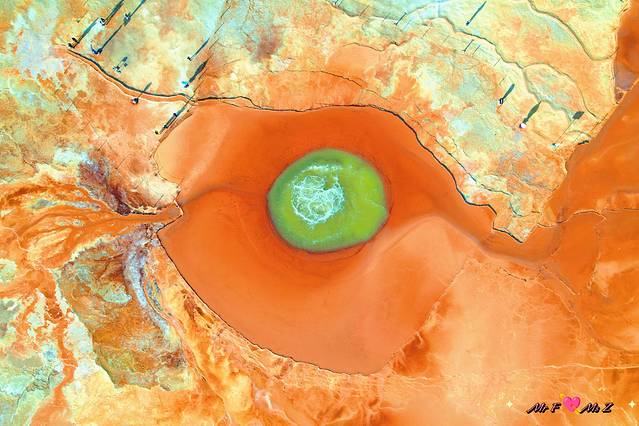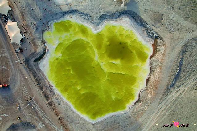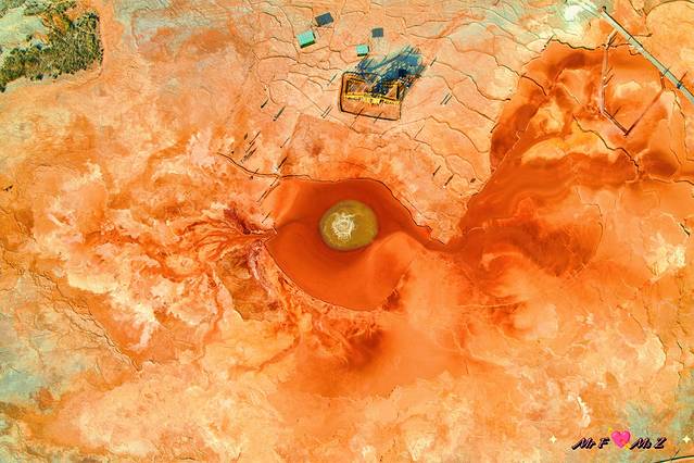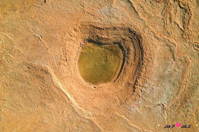 最令人惊叹的是泉周那一圈圈赭红色的沉积纹路,如瞳孔外围的血丝,也如大地的年轮——那是硫磺矿物质与铁离子经年沉淀所绘成的天然画卷。从空中俯瞰,它才真正展露全部的神秘:蜿蜒的红色水流勾勒出“龙眼凤羽”的奇妙形态,纹理分明、色泽浓烈,仿佛不属于这个世界。