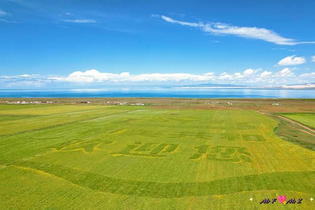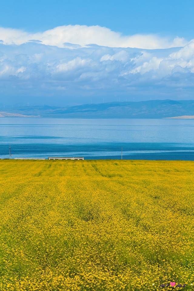 藏语中,青海湖被称为“措温布”,意为“青色的海”,它是大自然给予青藏高原的馈赠。每年7-8月间,湖畔油菜花盛放成一片金黄的海,与湛蓝的湖水形成大面积的冷暖对比,色彩艳丽,俨然一幅天地为框的油画。