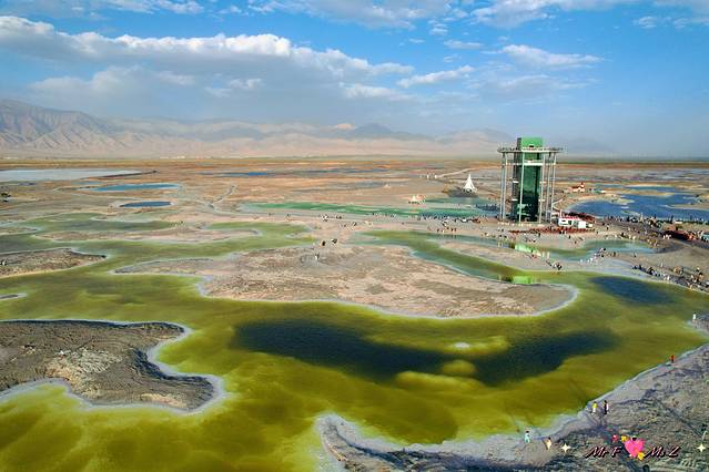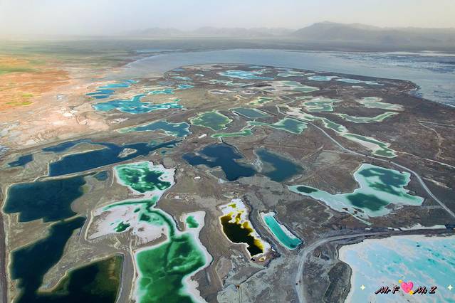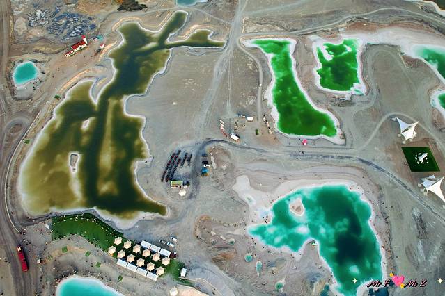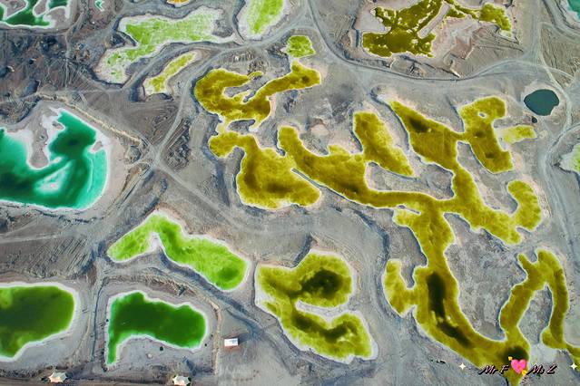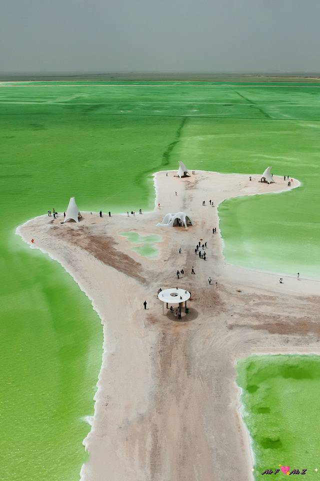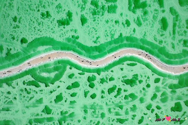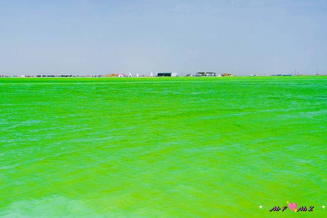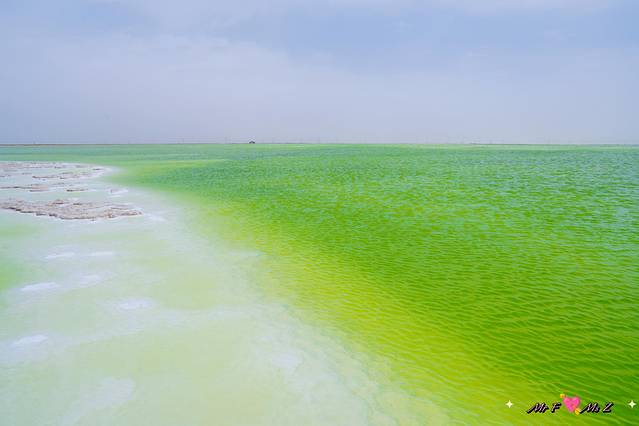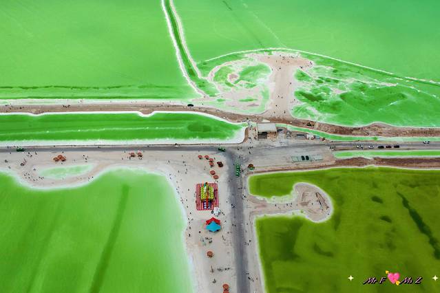 入伏之后,盐湖更显魔力。矿物质与藻类相互作用,将湖水染成一片巨大的调色盘,从浅碧到墨绿,层次分明。