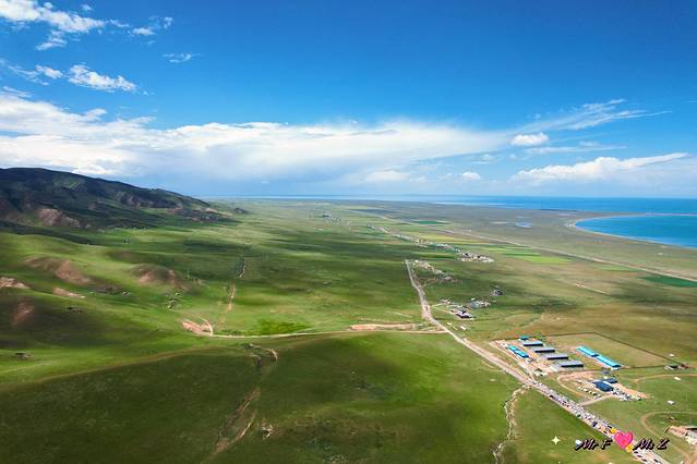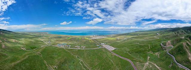 立于高处俯瞰,青海湖以全景的方式呈现在眼前——远处雪山巍峨,湖水如碧玉般澄澈,湖畔草原绵延,成群的牛羊为这幅高原画卷添上了灵动的一笔。