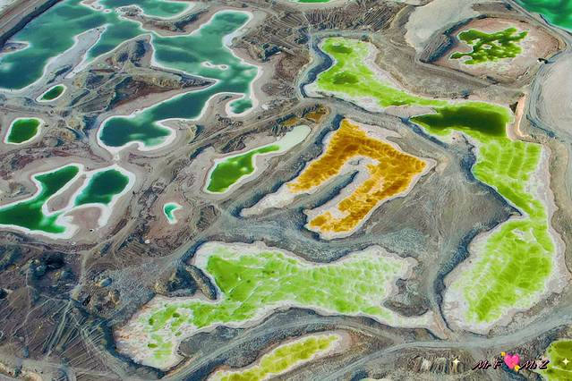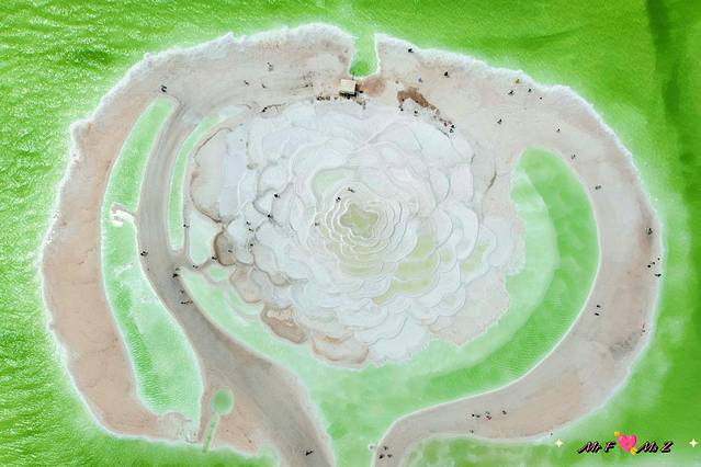 从空中俯瞰,整个湖区分布着大小不等、形态迥异、深浅不一的数个盐池,在远方雪山的映衬下,恍如异星地表。