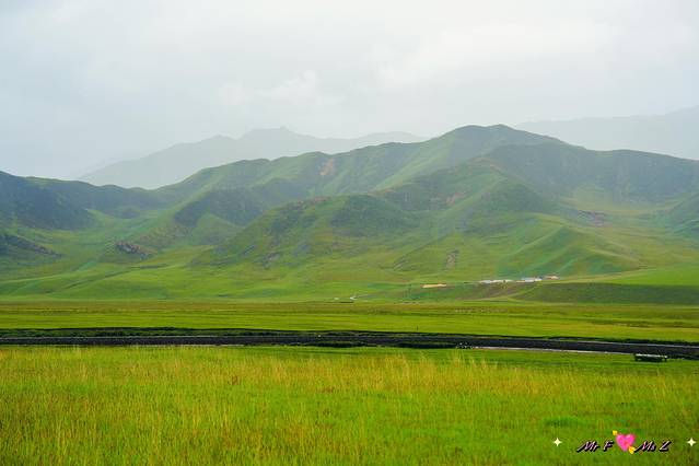 随着海拔升高,视野豁然开朗,整片丘陵状的草原泛着翡翠般的光泽,起伏的山峦如绿色的波浪一直延伸到天际。