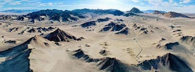 黑独山又称黑戈壁,是祁连山支脉的最西端起源。山体主要由黑色砾石与玄武岩构成,历经漫长的风化侵蚀和地质运动,呈现出独特的线条与纹理。