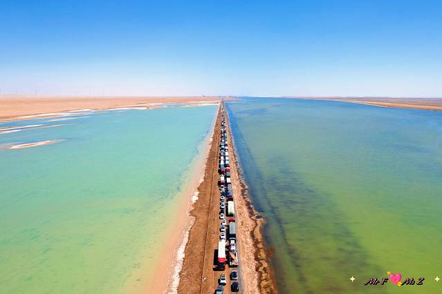 行驶在G315国道上,还有一个最奇妙的体验是穿越西台吉乃尔湖。笔直的公路如一道长堤将湖面一分为二,带来“车行水中央”的独特感受。更令人称奇的是,公路两侧的湖水呈现出截然不同的色彩:一侧因含铜离子较高,呈现出清澈透亮的蓝绿色;另一侧则因盐度及矿物质成分差异,荡漾着深沉浓郁的黄绿色。