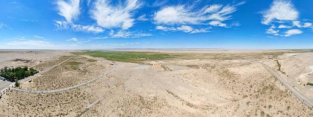 离开黑独山,向东北方向前行,当G215国道右侧出现一片广阔的蓝色湖泊时,意味着我们已进入甘肃省境内。这片湖泊正是甘肃最大的内陆湖——苏干湖,它也是阿克塞哈萨克族重要的夏季牧场之一。我们未作停留,而是直奔甘肃的第一站——那座在诗词里、在历史中回荡了千年的玉门关。