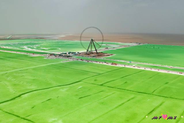 然而受气候与水文变化影响,目前(2025年8月)东台吉乃尔湖已几近干涸,令人惋惜。不过,与之相邻的一里坪盐湖在一定程度上可以弥补这份缺憾,它同样拥有奇幻的色彩和辽阔的盐滩,只是距离公路较远,需要借助无人机的帮助才能一睹其风采。