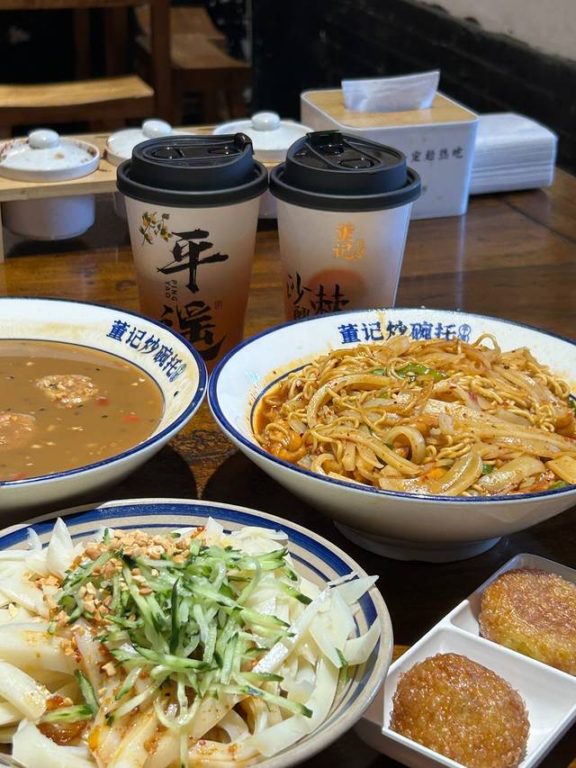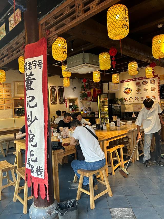 不得不说董记炒碗托家的装修风格还是很吸引人的。首先这家的房子是一个古建筑,外面的门一看就很有历史感。他家主打的就是炒碗托,有肥肠肘花炒碗托、牛肉烤肠炒碗托,如果这两种碗托都不够吃,