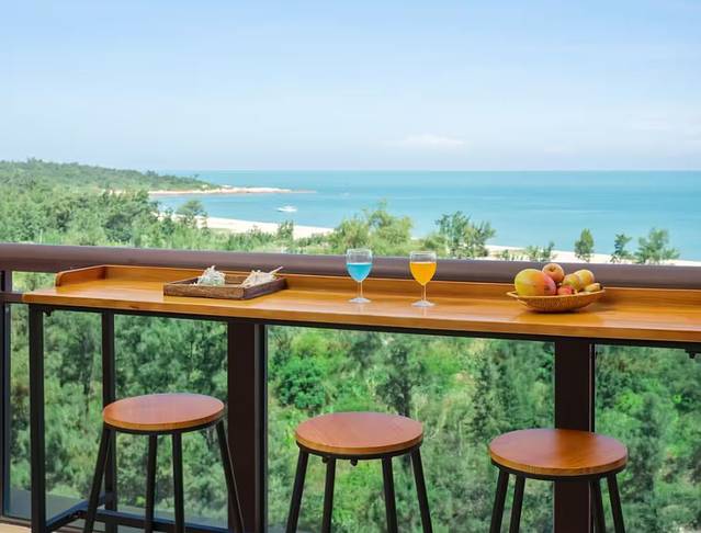 把浪漫刻进 DNA里,木质凉亭被暖黄灯光包裹,粉紫色晚霞从三角窗漫进来,海面碎金般的波光和远处货轮灯光连成星海