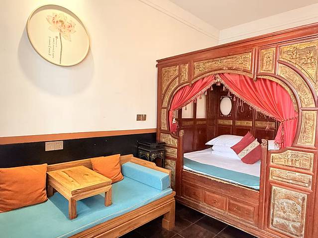 印迹·慢生活民宿:位于西湖景街25号,距离县衙非常近,出门右拐2分钟可达。是一座具有明清古建筑装饰风格的两层木质小楼,灰墙青砖,高挂大红灯笼,古色古香,很有氛围感~房间类型有土炕房、龙凤床、影音房等,里面的灯、挂饰和摆设都各有特色,细节满满。