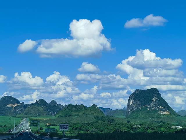 4号早7点退完房,我们拖着行李上了师傅的车,从南宁市区出发,驶向崇左市大新县方向。国庆期间的高速几乎空荡荡的,广西的高速公路路况极佳,车少景美,一路上青山连绵、云雾缭绕,窗外风景如画。
