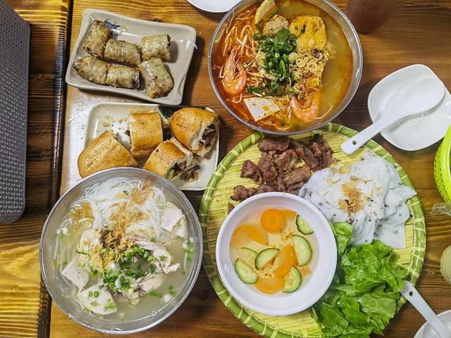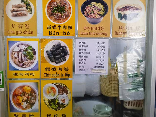 短暂出海归来,我们准备返回东兴市区。刚走到公交站,远远看见5路车正缓缓启动,情急之下,我们一边狂奔一边大声呼喊师傅等等,万幸的是,司机听到了,稳稳刹住车——又一次“无缝衔接”,顺利搭上了回城的班车。抵达终点站“珠江啤酒广场”时刚过上午11点,正好顺路去打卡那家网上推荐已久的越南风味小店——秋云越南烤肉粉螃蟹粉。才11点多,门口已排起长队,好在出餐极快,约二十分钟就轮到我们。我们点了招牌烤肉粉、越南鸡粉、蟹膏粉、烤肉面包和炸春卷,个人最爱的是烤肉面包和鸡粉。还在隔壁摊位买了几杯柠檬茶和水果茶,酸甜清爽。