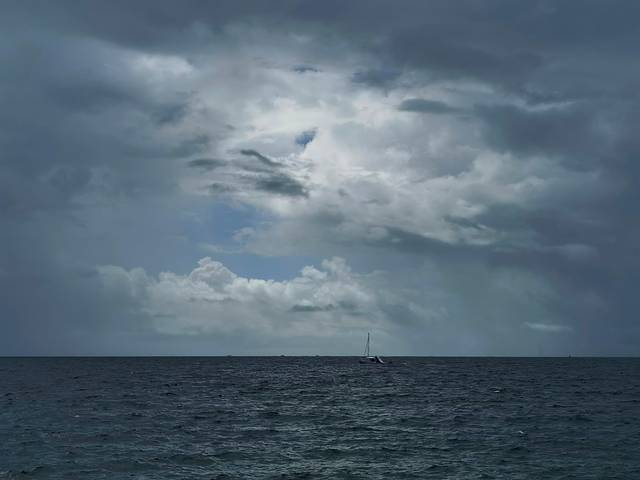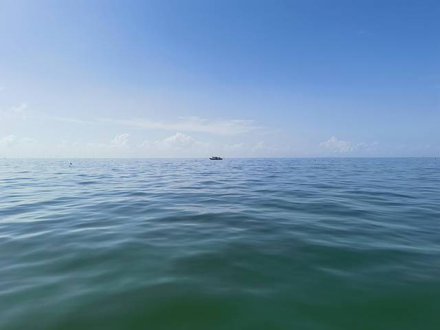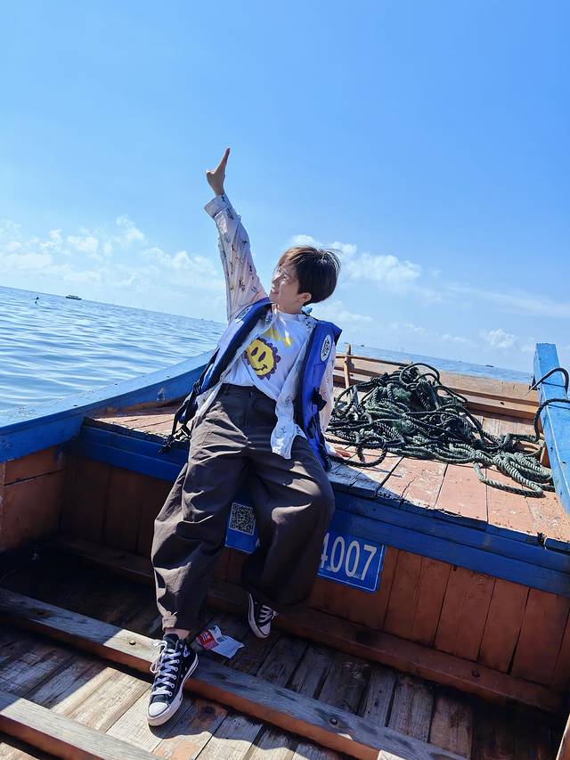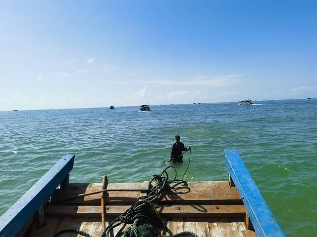 那天海面风浪不小,开船前老板甚至得站在齐膝深的海水里,牢牢扶住晃动的跳板,帮大家安全登船。这片海域水色深邃幽蓝,阳光洒在波面上泛着细碎金光,经历了台风过境,还能看到如此清澈的海水,已让我们心怀感激。