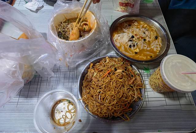 南宁的夜市颇多:中山路美食街、平西夜市、琅西夜市、西关夜市……我们就近选了建政路夜市。夜市巷子不宽,网上推荐的热门摊位,像古记卷筒粉、甘家老牌卷筒粉、肥诺诺炸鸭腿,全都排着长龙。眼看队伍一时半会儿轮不到,索性随缘尝了些小吃:南宁老友粉、牛杂、卤鸭货等,都还不错。不过我最喜欢的是那家老牌豆浆油条,豆浆醇厚,油条外酥里嫩。