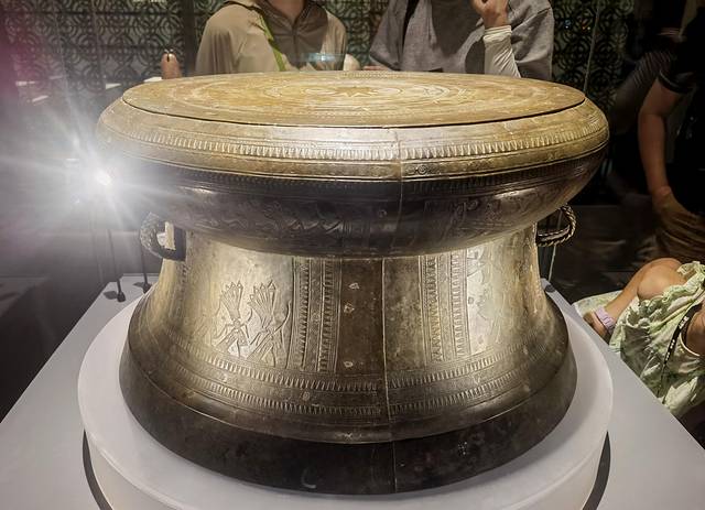 翔鹭纹铜鼓,鼓面中心为太阳纹,十二芒,象征太阳崇拜