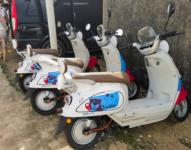 在白浪滩租了哈啰电动车,虽然一开始折腾了一阵子,好在最终顺利骑上了车。我们计划从这里直接骑行到怪石滩,行程约12公里,原本设想骑行的是一条风景如画的环海公路——结果发现主路离海其实挺远,根本看不到什么海景。更没想到的是,一转入环岛西路,就遇上修路路段,尘土飞扬,越靠近怪石滩,路况越差:道路不仅变窄,还坑洼不平,颠簸得厉害。加上这里是未经开发的“野景区”,几乎没人管理,停车都是当地农户 划个线就收费,乱糟糟的,居然连电动车都要收费。