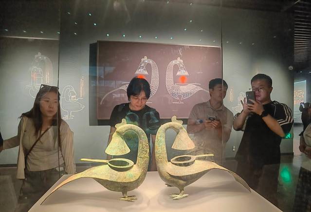 羽纹铜凤灯,雌雄成对保存,其独特设计通过腹腔贮水实现烟尘净化功能,灯盏燃烧时烟灰经颈部管道导入腹腔溶解于水,是中国古代环保工艺的典型范例。