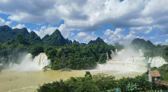德天瀑布与紧邻的越南板约瀑布相连,中越两国以德天瀑布至硕龙镇14.5千米的归春河为天然国界,德天瀑布自然景观分为枯水期、丰水期,丰水期一般是4月至11月。本来国庆期间是最美的时候,结果因为台风天气造成上游水位猛涨,导致瀑布水量巨大,网友戏称为“黄金瀑布”,也是难得一见的。由于水位过高,竹筏都已经停开了,错失近距离欣赏瀑布的机会,只能远眺,不过在各个观景台也能听到轰隆隆的水声,加之天气晴朗,观赏效果也还算不错的,不过由于游客太多,栈道拍摄的好机位几乎都挤满了人,就匆匆走过一遍欣赏风景了,但是逛一逛停一停,也差不多花了三个小时。