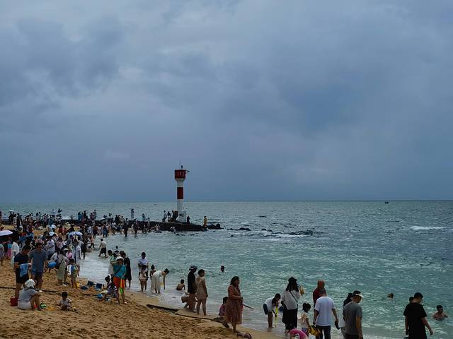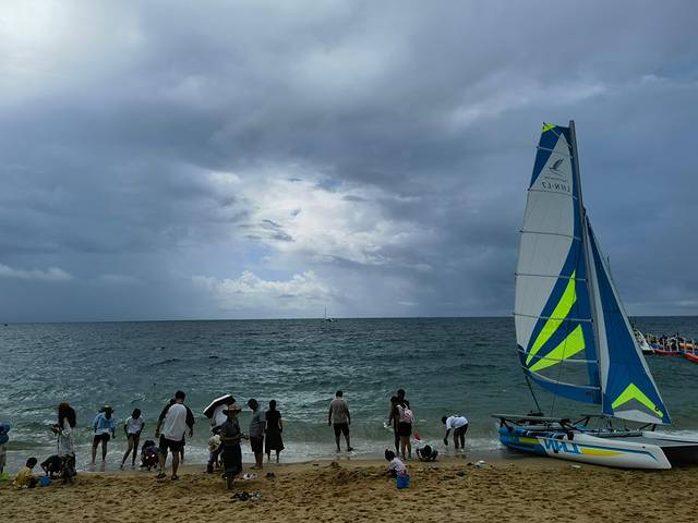 相比怪石滩、白浪湾,白沙湾算是开发得比较到位的,有保安值守,游玩项目也丰富。我们对海上项目特别感兴趣,原本打算体验帆船,可惜那天天气不佳,海面风浪很大,所有水上活动都暂停了。问了工作人员才知道,就连已经付费排队的游客,估计也要等一个多小时,还得看海况是否好转。无奈之下,只好脱了鞋,在海岸边散散步,沙子非常细腻,海浪一遍遍地冲刷着脚背,倒是意外地治愈。