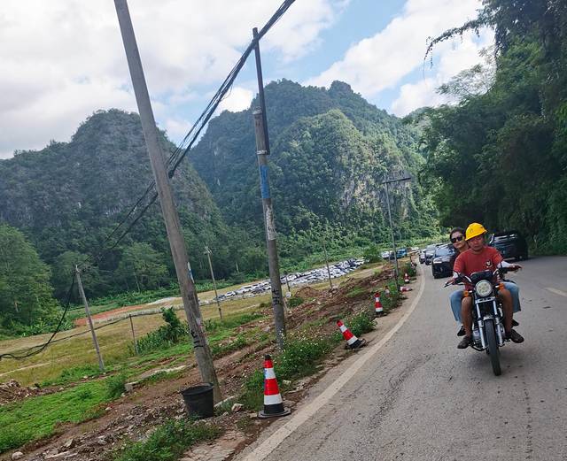 前半程非常顺畅,但就在离德天瀑布景区还有8、9公里的地方,突然堵得水泄不通。问了现场交警才知道,是因为游客太多,景区停车场已饱和,正在实行限流措施。好在堵了大约半小时后,车辆还能缓慢挪动。可到了离景区只剩两三公里时,车子几乎纹丝不动,真是堵的没脾气了。这时,路边不少村民开始用摩托车载客进景区,一开始开口就要50元/人,实在离谱。我们索性下车走了一小段,到了前面的集镇再搭摩托车,价格立马降到20元,还算能接受。师傅则趁这时间去给他的电车充电,我们就前往景区入口开始游览。