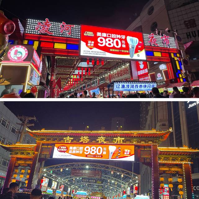 凌河夜市热闹非凡、人山人海,美食、小吃一家接一家。与其一路之隔的古塔夜市与其相比差多了,摊位少,人也少。