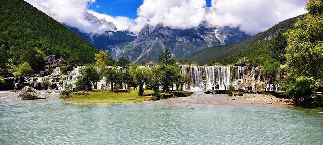 玉龙雪山冰雪融化成河水从雪山东麓的一条山谷而过,因月亮在蓝天的映衬下倒影在蓝色的湖水中,故名“蓝月谷”。
