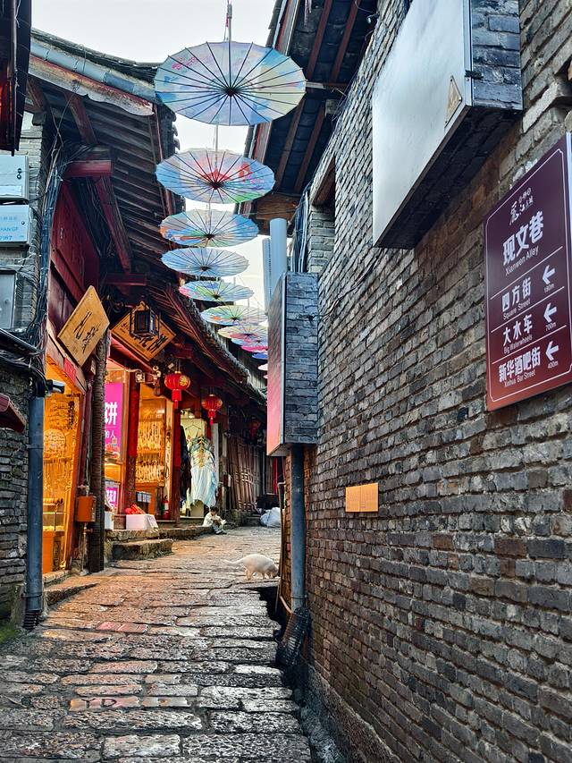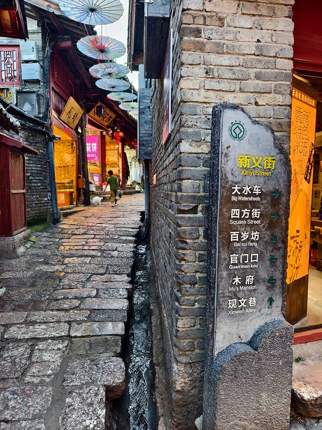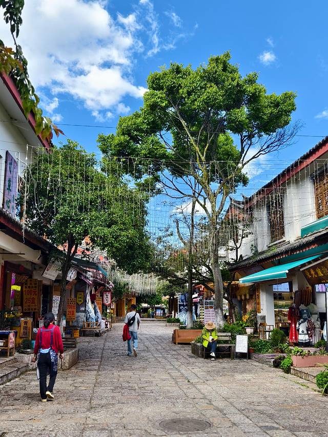 迎面便是一条光溜溜的石板路,路两旁是店铺,卖些银器、扎染、普洱茶之类。