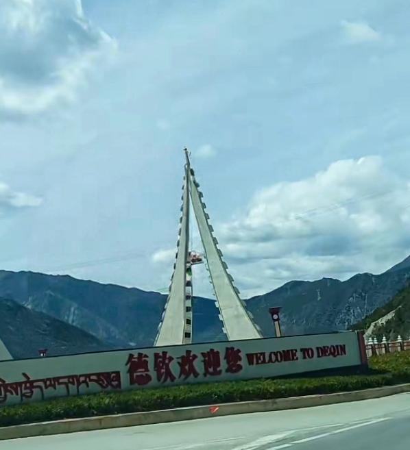 经过得荣,马路两边横跨着大大的指示牌。