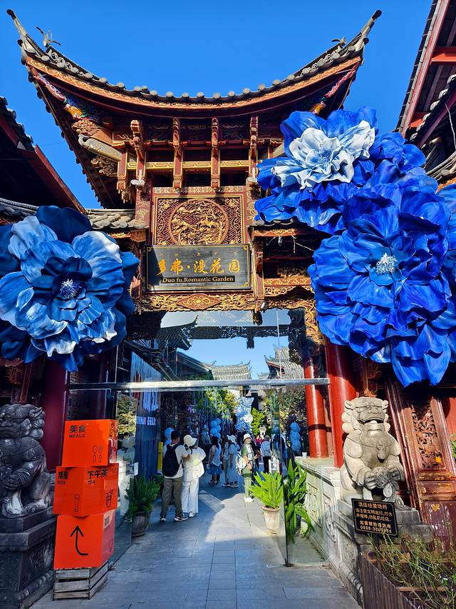 一家挨着一家的店铺,门口都摆着招揽生意的牌子,有卖鲜花饼的、卖银饰的、卖民族服饰的,还有各种网红奶茶店、咖啡店,招牌一个比一个显眼,挤得整条街满满当当。
