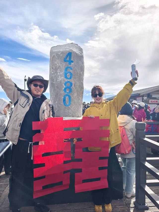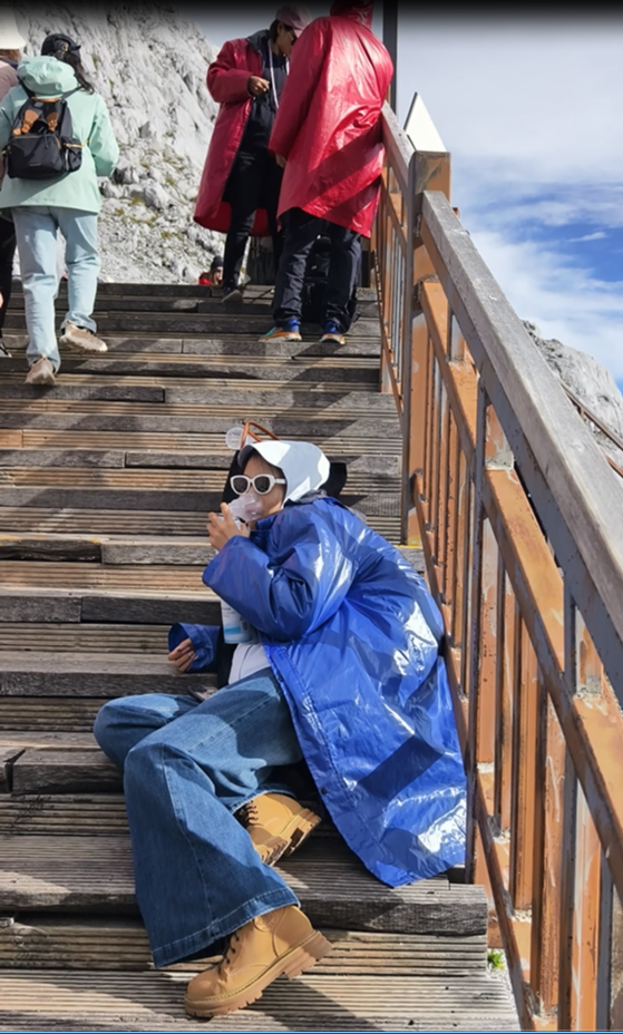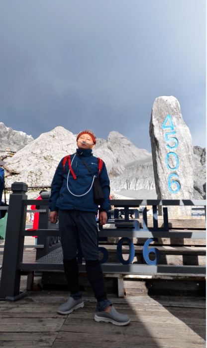 从缆车上下来后会先到达雪山主峰扇子陡正下方的上部站,这里海拔4506,尹同志已经开始吸氧了。