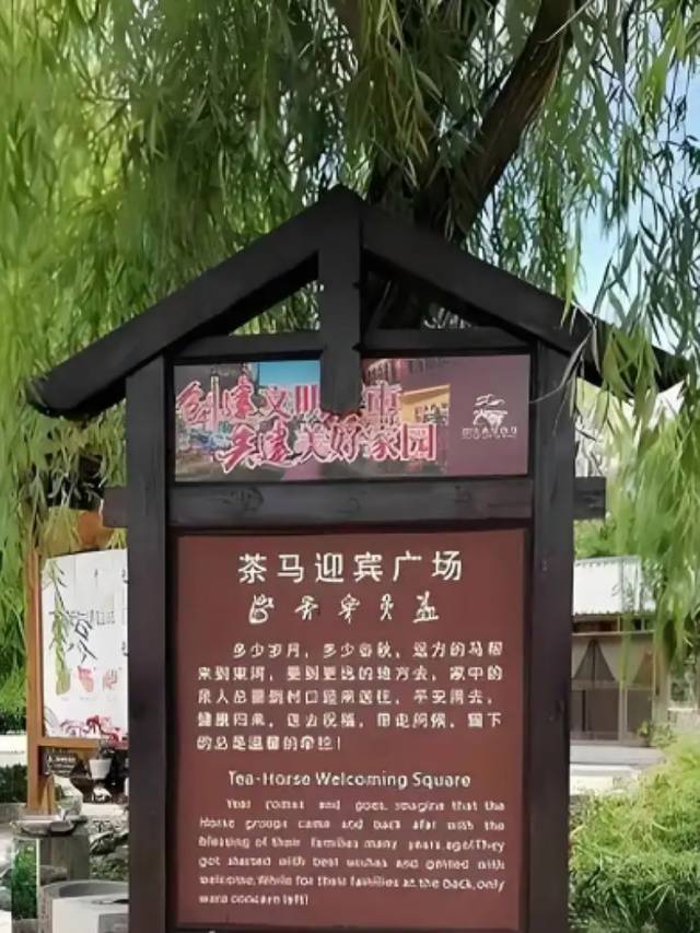 穿过古镇大门,就是茶马迎宾广场,这一新建广场继承弘扬了古镇悠久的茶马历史文化。