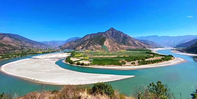 万里长江从青藏高原一路向南,在云南丽江这里来了个100°的急转弯,由南转向东北,才有了全新的华夏文明。