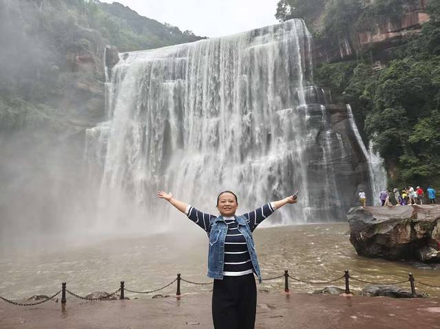 我们找了几处观景台拍照,从正面拍瀑布的全貌,水砸在潭里的声像在耳边;从侧面拍水雾里的彩虹,颜色鲜得像能摘下来;还录了段视频发朋友圈,想把这份鲜活,分享给没到的人。“赤水丹霞大瀑布 AAAAA”“此生必达” 的打卡牌前,大家轮流站定,岳母笑着说:“这瀑布比照片里还活,连风里都带着水的甜。” 微风裹着水雾拂在脸上,凉丝丝的,连头发丝都沾了潮气,浑身的疲惫都散了。