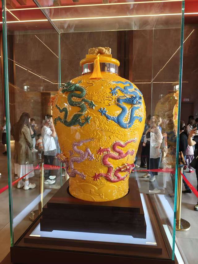 进了博览馆,展柜里摆着各式各样的五粮液 —— 早期的出口版、纪念礼盒、联名限定款,岳母指着一瓶复古包装的酒说:“这瓶子跟以前供销社卖的一样,看着就亲切。” 女儿站在宣传片屏前,安安静静看完介绍,跟我们说:“原来用五种粮食酿酒,高粱、大米、糯米、小麦、玉米,难怪香味这么醇厚,学到了。”