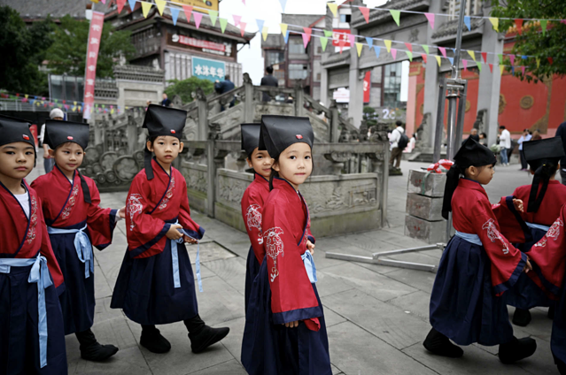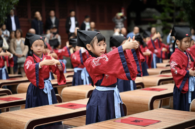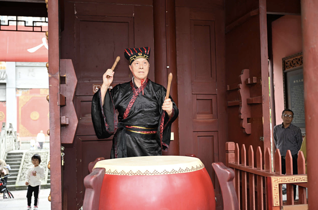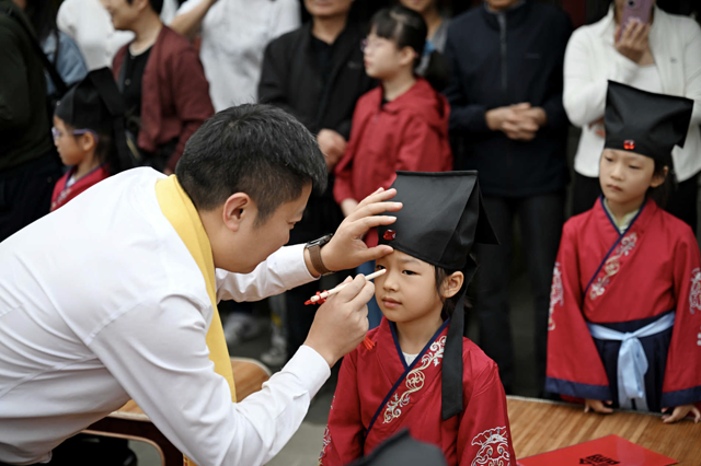之后便是“朱砂启智”、“击鼓明智”的环节,眉心点红点,秒变“小状元"”,大鼓咚咚响,智力蹭蹭长。这波仪式感,我给满分!