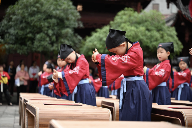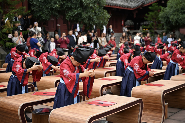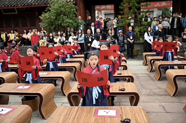 面向师长行礼,教会孩子对待师长要恭敬有礼,也象征着正式开启求学之路。听说这次文庙开笔礼还特请了当地资深的教育工作者为孩子们授礼。