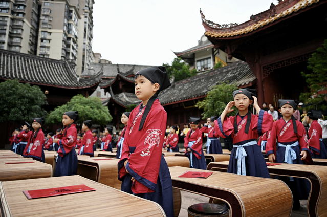 活动开始前就已经有很多小朋友到场了,他们身着汉服,宽袖长袍,衣袂飘飘,俨然一副“小书生”的模样。